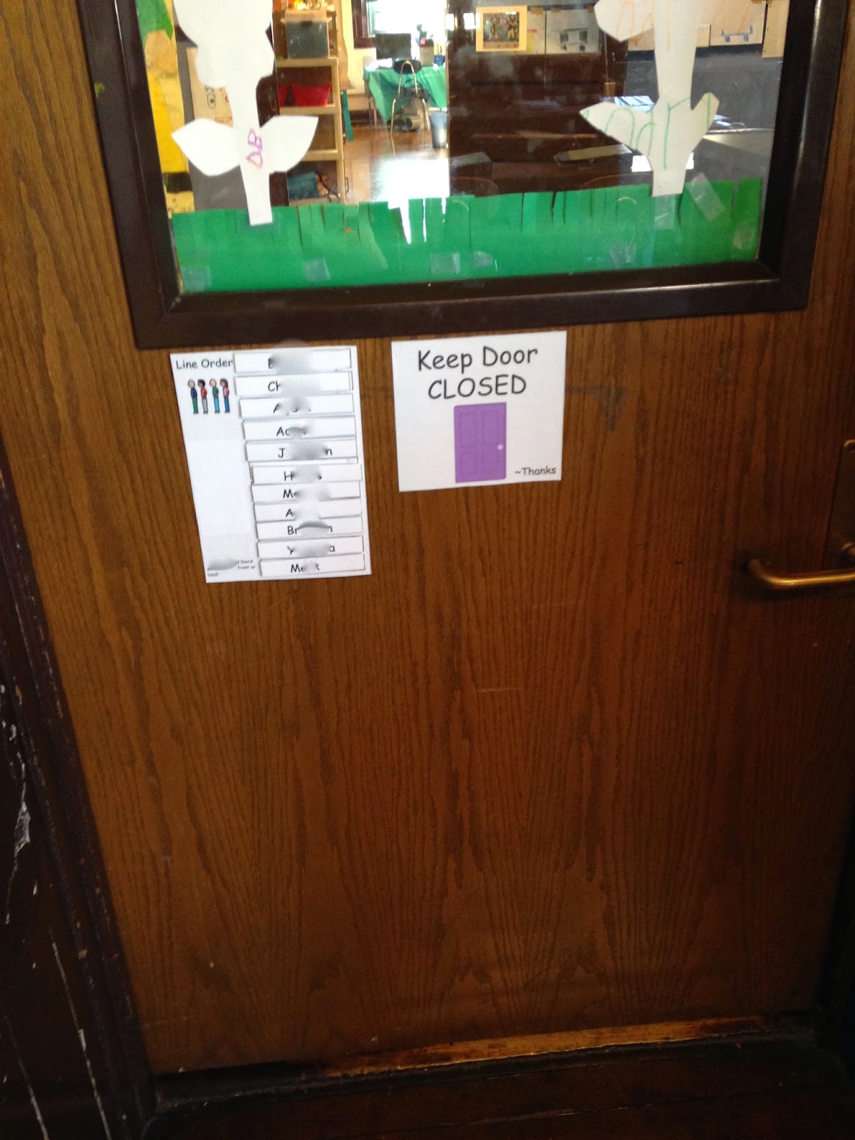 Well, I have tried coaching my kids through this; showing visuals for appropriate line behavior, reinforcing them when they are appropriate in line and making them go to the end when they do anything inappropriate, and it just wasn’t enough. In past classes, this could be enough to work, but not with this bunch. So, we started using a visual for line-order. The kids keep this order for one week, then the person in the front goes to the back and the rest of the line-order remains the same. I have this posted by the door and the kids’ names are velcroed on, so we can easily switch it each week.